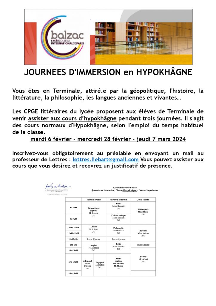 Les élèves de Terminale ont la possibilité de venir suivre des cours dans la classe d’Hypokhâgne au cours de trois Journées d’immersion les mardi 6 février, mercredi 28 février et jeudi 7 mars 2024.